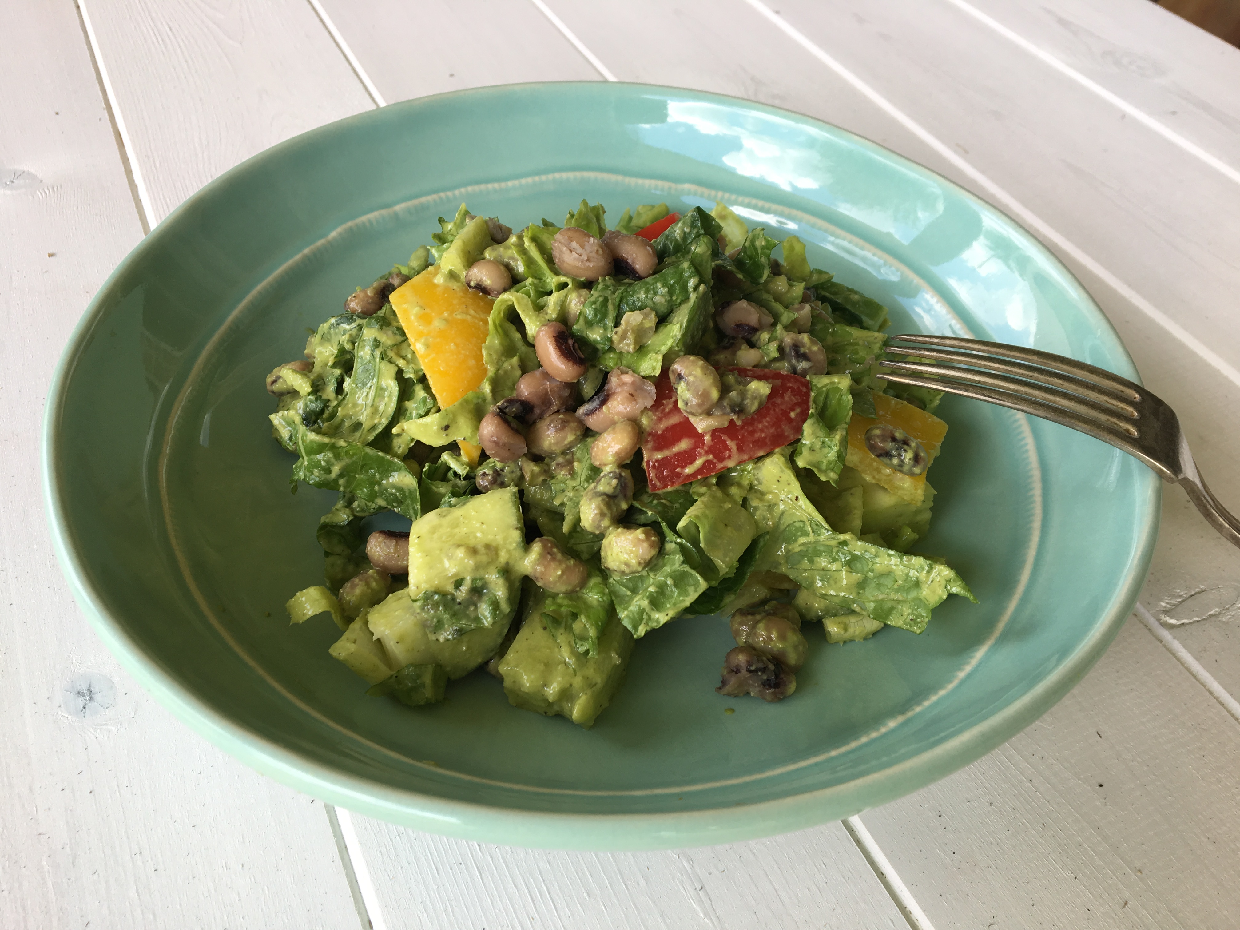 Chopped romaine, diced cucumbers, chopped colored bell pepper, Boiled black eyed peas dressed with best herbed sesame dressing.