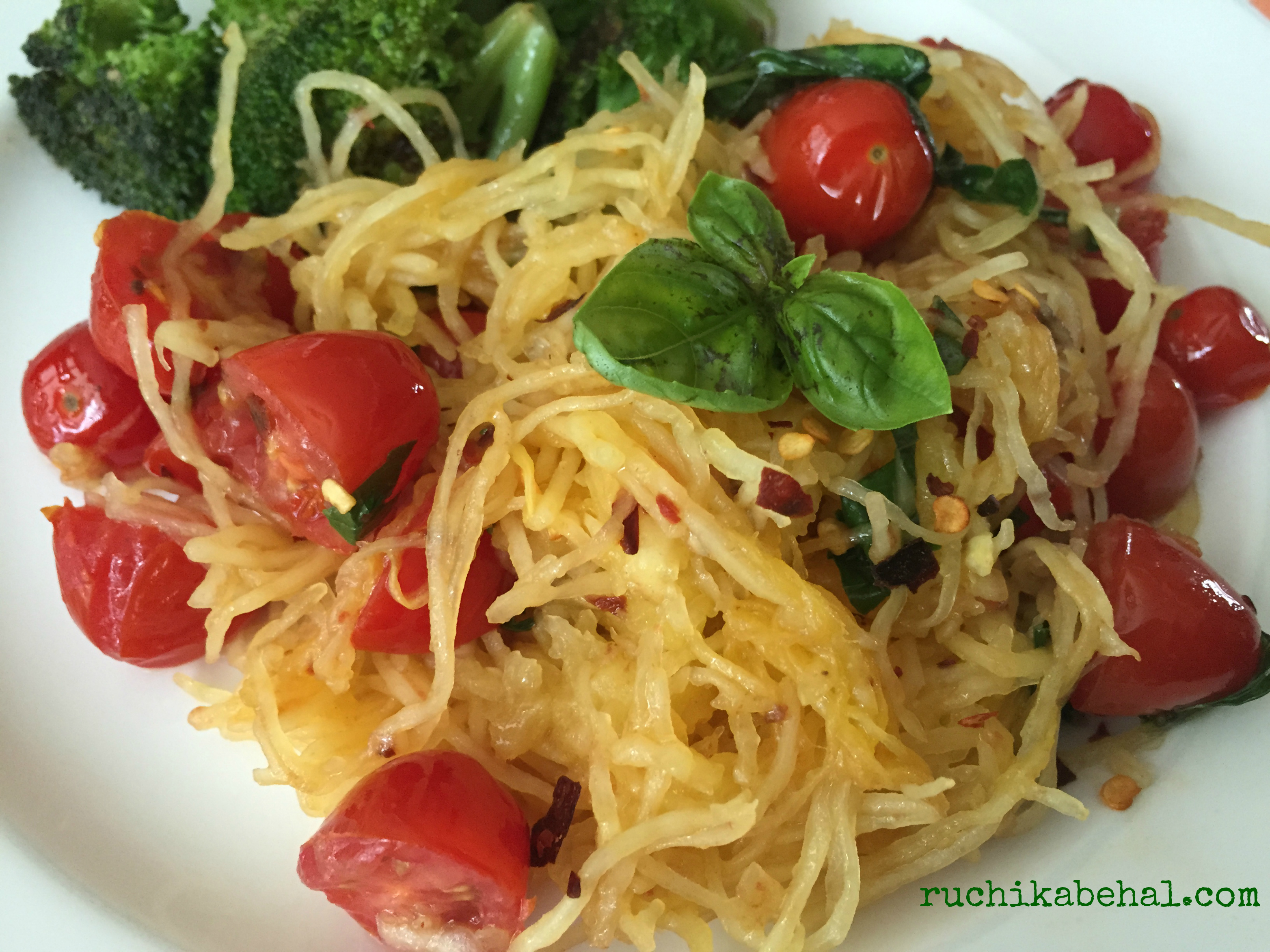 Sauté rather almost burn chopped garlic in extra virgin olive oil. Add a large handful of chopped basil leaves, red chili flakes, salt and pepper, and a handful of halved cherry tomatoes. Toss in the spaghetti squash and drizzle a little bit of Extra Virgin Olive oil on top. Serve with a side of Broccoli or grilled meat. If you prefer to make this a meal without any animal protein, sprinkle 1 tablespoon pine nuts and 2 tablespoon hemp seeds . Enjoy the magical noodles!